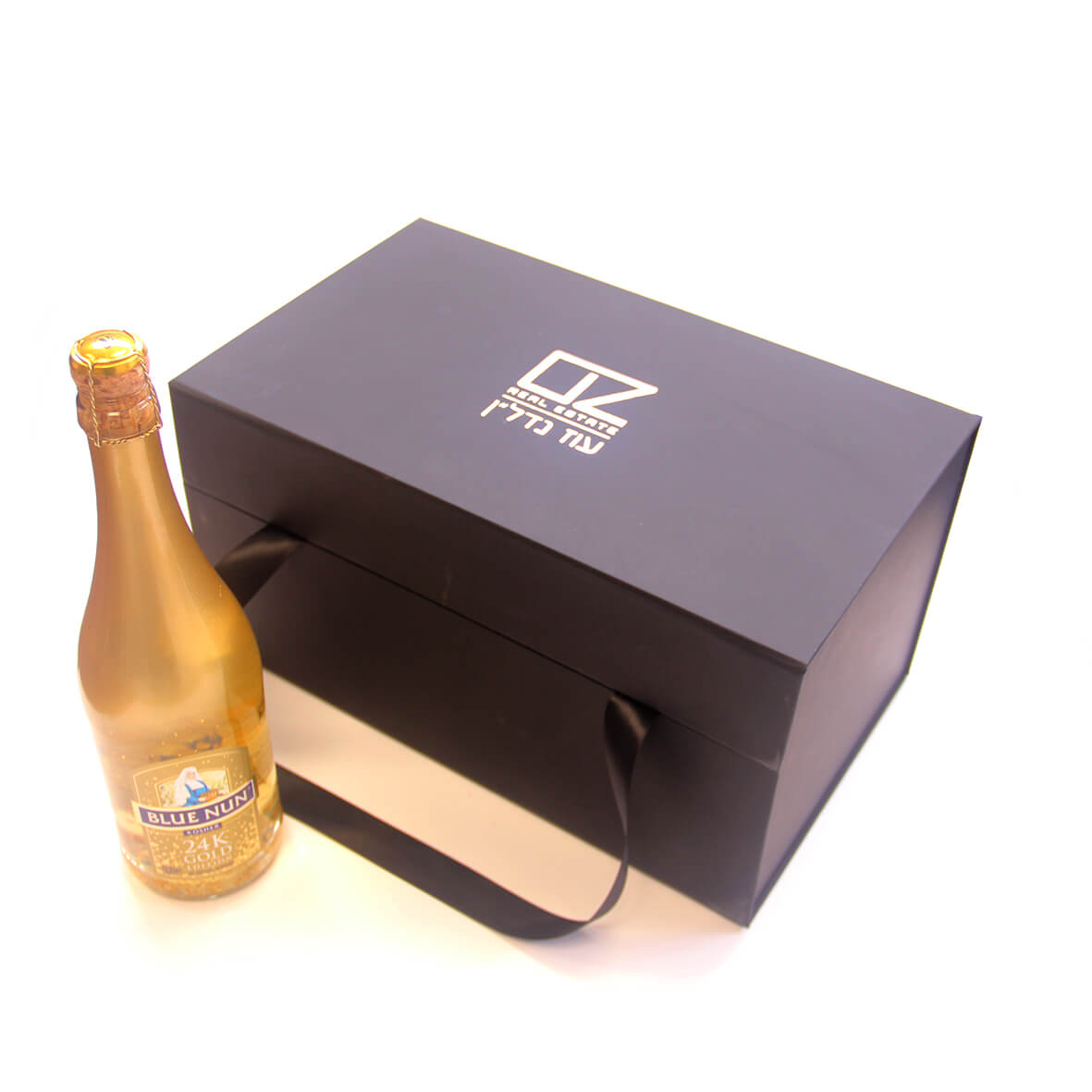 מארז יין מקרטון ממותג עבור חברת "עוז נדלן" מארז מצופה בנייר "פליק" שחור שמיובא מחו"ל. במה פנימית מספוג בעובי 2 ס"מ דפוק בשטנץ צורני עבור 2 בקבוקי היין שמגינים על המוצר בזמן הנשיאה. קרטון קשיח 2 מ"מ מצופה מלא בפנים ובחוץ. הטבעה בפוייל כסף + 2 סרטי משי להרמה. ניתן ליצור כל קופסאת בקבוקי יין בעיצוב והתאמה אישית