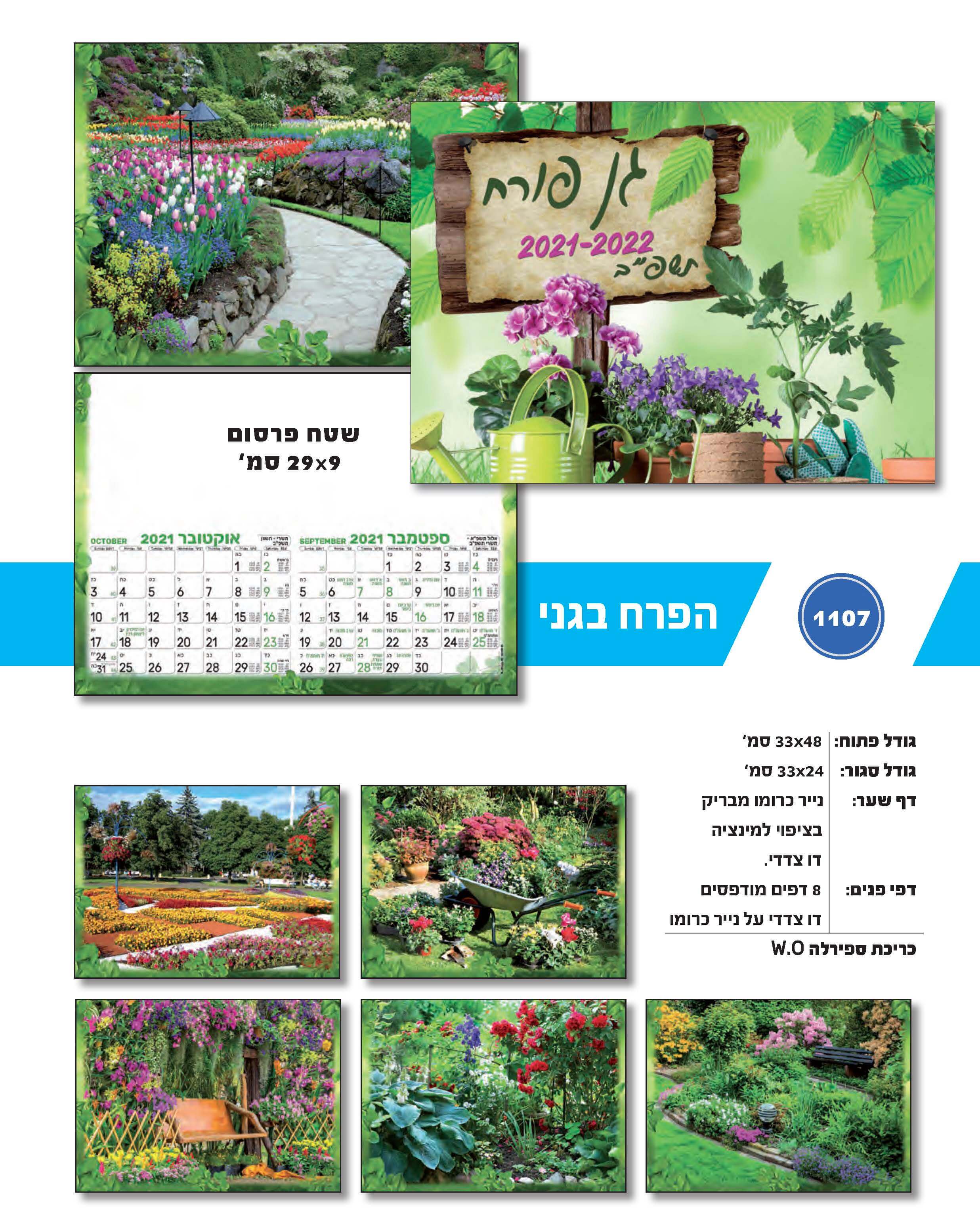 ההדפסה כוללת תמונות מרהיבות הקשורות לפריחת גינות וגנים, תאריכון דו חודשי נוח לשימוש עם סימון ברור ובולט של חגי ישראל