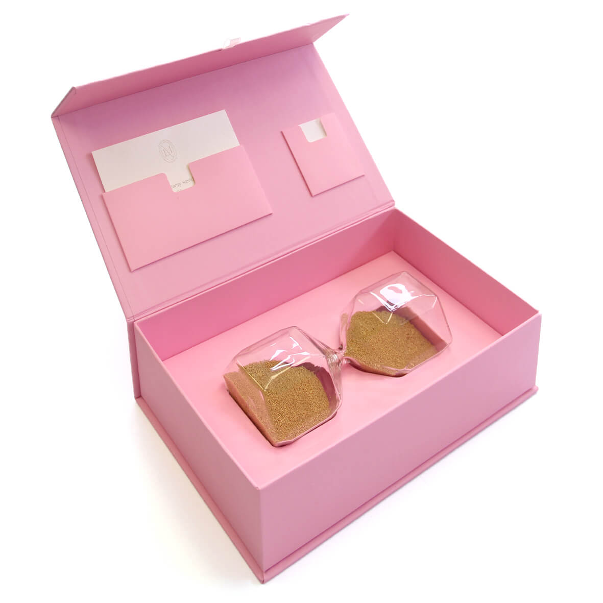 קופסא מעוצבת קשיחה עם סגירה מגנטית הכולל במה פנימית המותאמת למוצר שעון חול ו- 2 כיסים מודבקים לכרטיסי ביקור. דופלקס 300 גרם גב לבן מודפס דפוק בשטנץ בהתאמה אישית. הדפסה פנטון צבע אחד על גבי נייר כרומו 170 גרם בציפוי למינציה משי והטבעת זהב הצמדה לקרטון קשיח 2 מ"מ. מידות:80*160*250 ניתן ליצור כל קופסא בעיצוב והתאמה אישית