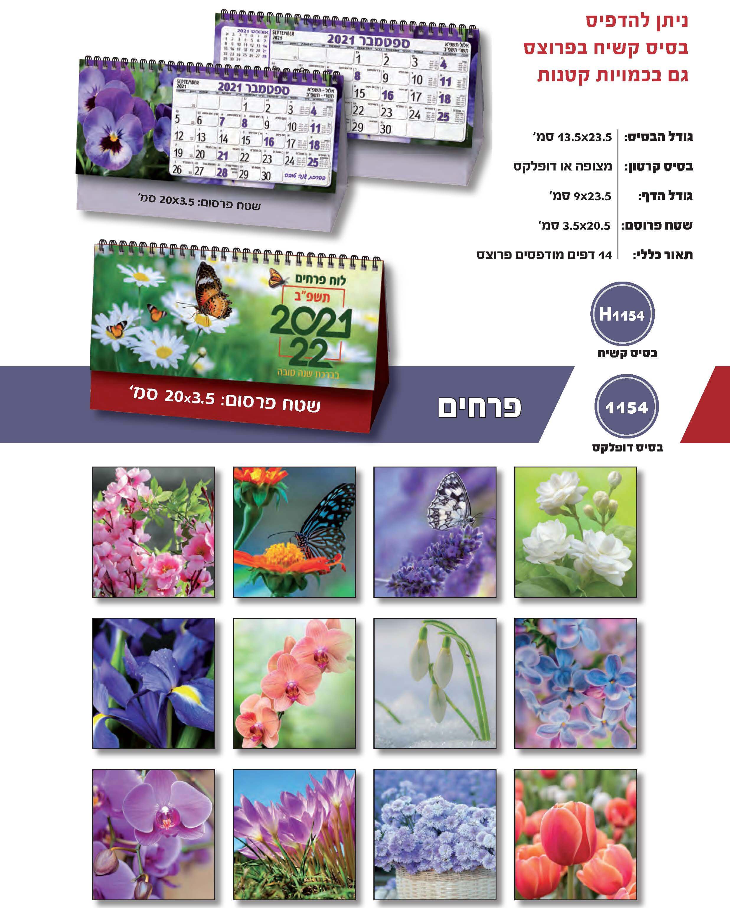 14 דפים בגודל 9/23.5 מודפסים פרוצס דו צדדי על גבי נייר כרומו מבריק, כוללים מצדו האחד תאריכון חודשי נוח לשימוש עם סימון ברור ובולט של חגי ישראל, מצדו השני תמונות פרחים ותאריכון חודשי נוח לשימוש עם סימון ברור ובולט של חגי ישראל בסיס דופלקס בגודל 13.5/23.5 ס"מ הדפסת פרסום בבסיס בגודל 3.5 /20.5 ס"מ כולל אפשרות להדפסת פרסום צבעונית כריכת ספירלה כפולה ( w.o )